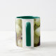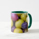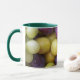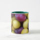 White mug with dark green handle and rim, decorated with a photograph of autumn fruits.
