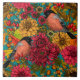 Hand-drawn autumn pattern featuring bullfinches, dahlia and chrysanthemum flowers, various berries, leaves and bugs