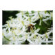 A photograph of a honey bee who has a leg with a ball of pollen stuck to it, as it moves about a group of white clematis flowers.