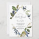 This autumn greenery bridal brunch invitation is perfect for a fall wedding shower. The modern rustic design features navy blue, sage green and gold leaves with sprigs of dark blue flowers.