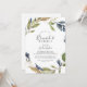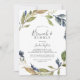 This autumn greenery brunch and bubbly bridal shower invitation is perfect for a fall event. The modern rustic design features navy blue, sage green and gold leaves with sprigs of dark blue flowers.