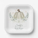 Fall wedding bridal shower paper plates featuring a white pumpkin greenery botanical fall theme and white sage table decor design.