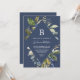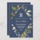 This autumn greenery navy diamond monogram wedding invitation card is perfect for a fall wedding. The modern rustic design features navy blue, sage green and gold leaves with sprigs of dark blue flowers.