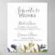 This autumn greenery signature drinks sign is perfect for a fall wedding. The modern rustic design features navy blue, sage green and gold leaves with sprigs of dark blue flowers.