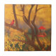 In a vivid yellow maple a male cardinal perches, keeping watch over his mate on the nearby bird feeder.
