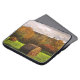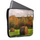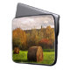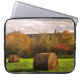 This fine art photography laptop sleeve presents a lovely autumn landscape in seasonal fall foliage colours of red, orange, yellow, brown and green. A storm has passed and the sun is breaking through the clouds onto a mown field with round bales of hay.