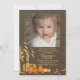 A delightful, fall season invitation that's perfect for either gender and any age. The brown burlap background has corn stalk bundles, hay, pumpkins and fall leaves on the ground. Just add your favourite photo to make it yours.