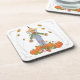 A fun and colourful pen and ink drawing of a happy scarecrow protecting a patch of orange pumpkins and other fall fruits and veggies graces these autumn inspired beverage coasters. Original artwork. Copyright Leah Wiedemer