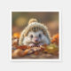 A small hedgehog is snuggled up in a knitted hat, surrounded by autumn leaves. Its bright eyes and gentle expression add a whimsical charm to the fall scene