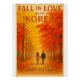 Travel poster design titled "Fall in Love with Korea", depicting the iconic tree-lined path of Nami Island during peak autumn