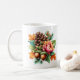 Coffee mug is shown with a lovely autumn pinecone and acorns floral art print. Autumn Is Beautiful Text.
