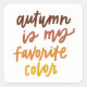 This design features the phrase "autumn is my favourite colour," presented in a stylish, handwritten script. The text is arranged in a stacked, centred alignment with each word occupying its own line, creating a visually pleasing flow from top to bottom. The colour palette is a gradient of warm autumn hues, transitioning from deep brown at the top for the word "autumn," to a lighter, rust orange for "is my," and finally to a vibrant yellow for "favourite colour." This colour transition not only reflects the rich spectrum of fall foliage but also reinforces the sentiment expressed in the phrase.