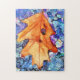 A pretty watercolor of a brown autumn leaf against a blue water background.