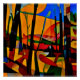 A.I .assisted print of vivid geometric shapes in bold Autumn colors create a dynamic cubist landscape among rocks and trees in abstract form.