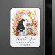 Personalised elegant wedding thank you magnet favours for your guests, featuring a bride and groom gnome couple and an autumn leaves arch illustration. Edit the card template with a date and the newlyweds' names.