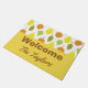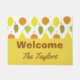 Personalise your doorstep with this Autumn Leaf Pattern Welcome mat. This mat showcases a green, yellow, brown leaf pattern on a white background. The bottom half has a tan background with brown print displaying sample text "Welcome The Taylors" Add this to your home today!