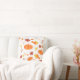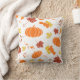 Throw pillow with autumn-themed pattern on white surface; pumpkins and dried leaves. Great for fall season!
