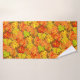 Seamless block pattern of stylised fall leaves in brown, red, orange, yellow, and green.