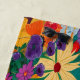 A vibrant and dynamic Drake Ireland-inspired illustration featuring a myriad of autumn leaves and flowers in a variety of bold, colourful shades. The pattern showcases falling leaves in hues of orange, red, and yellow, intermingling with various flowers in purples, blues, and greens. The background features a whimsical garden scene with a wooden fence and a rustic bench, creating a cheerful and lively atmosphere.