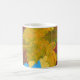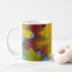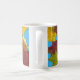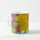 A white coffee mug with a design of brightly coloured Autumn leaves against a sky blue background.
