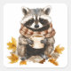 Autumn leaves cosy racoon with cup of coffee square sticker