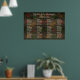 Dark wood and autumn leaves background, wedding seating chart poster. List seating for up to twelve tables, with eight (or fewer) guests at each. This 23 x 36 inch seating chart has off-white text in both script (for numbers) and printed fonts for guests' names. Bride and groom names at top in elegant and modern, hand-written font with one or two lines for date and location of celebration Tables are listed horizontally, but that is easy to change by changing the numbers using the templates. For fewer tables, simply delete sections as needed, keeping the look symmetrical. Upgrade the paper if you wish.