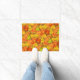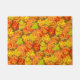 Seamless block pattern of stylised fall leaves in brown, red, orange, yellow, and green.