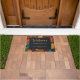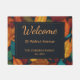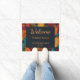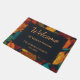 A seasonal design of leaves adorns this elegant doormat for the Fall season. The Autumn leaves are golden orange, green and blue, forming an attractive backdrop. The central section is light orange text on a deep blue background, and displays a warm 'Welcome' at the top in script typography. The mat can be personalised with your address, name(s), and date 'established' at this residence. An ideal housewarming gift and a welcoming accessory for your guests.
