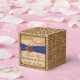 This gorgeous 2"x2"x2" rustic autumn wedding favour box in fall colours of burnt orange, rust, gold and brown has images of three dried maple leaves on it with a PRINTED royal blue ribbon and a brown FAUX burlap sack background with an aged burnt paper look overlay on it. If you need assistance, please email niteowlstudio@gmail.com.