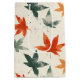 This illustration features a charming, minimalist pattern of autumn leaves in vibrant shades of red, orange, and muted green. The leaves are scattered across a soft beige background, with delicate splatters of black ink adding a touch of texture and artistic flair. The design captures the essence of fall, evoking a sense of warmth and natural beauty.