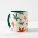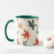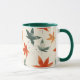 This illustration features a charming, minimalist pattern of autumn leaves in vibrant shades of red, orange, and muted green. The leaves are scattered across a soft beige background, with delicate splatters of black ink adding a touch of texture and artistic flair. The design captures the essence of fall, evoking a sense of warmth and natural beauty.