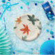 This illustration features a charming, minimalist pattern of autumn leaves in vibrant shades of red, orange, and muted green. The leaves are scattered across a soft beige background, with delicate splatters of black ink adding a touch of texture and artistic flair. The design captures the essence of fall, evoking a sense of warmth and natural beauty.