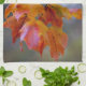 A close up look at some red and orange maple tree leaves with a blurred background.