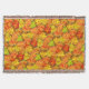 Seamless block pattern of stylised fall leaves in brown, red, orange, yellow, and green.