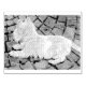 Seasonal Fall Autumn West Highland White Terrier laying on a stone patio with fallen leaves. Westie dog peeking over a flowering bush. Isobel. Copyright © 2025 Angi Laframboise. All rights reserved. Fine art dog breed gifts for dog lovers.