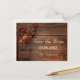 A lovely romantic Save the Date postcard featuring a tree with colourful leaves, roses and candle lit lanterns on a rustic wood background