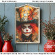 A fantastical figure sits amid autumn leaves, dressed in a richly detailed patchwork jacket with spiderweb textures. With red hair, painted skin, and a clown smile, this curious character deals a hand of cards. A tall, eccentric top hat crowns the look, adorned with whimsical patterns, and a perched butterfly—strongly evoking the Mad Hatter from Alice in Wonderland. The design is both theatrical and dreamlike. Artwork similar to a digitally painted storybook fantasy portrait with autumnal whimsy…..COLOR COMBINATIONS: Red, orange, yellow, brown, white, grey…..PERFECT FOR: