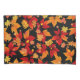 Autumn Midnight, display a vibrant pattern of autumn leaves against a black background. The leaves are a mix of bright red, orange, yellow, and gold hues, representing a variety of species like maple, oak and chestnut. `the contrast between the vivid colours of leaves and dark background creates a striking and dramatic effect, emphasizing the warm tones and intricate detail of the foliage. smaller leaves, acorns and twigs are scattered throughout, adding depth and texture to the pattern. The overall has design has an energetic and festive feel of a lively autumn night.