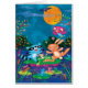 Artist: Elisa Chavarri | Racoon and bunny and frog and owl dancing in the pond at night with a big autumn moon above them in the sky