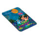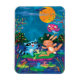 Artist: Elisa Chavarri | Racoon and bunny and frog and owl dancing in the pond at night with a big autumn moon above them in the sky