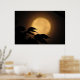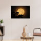 It's autumn, and a luminous golden yellow full moon has risen behind the black silhouettes of leaves blowing in the breeze on this dramatic fine art photography poster. The background is illuminated in tones of orange, gold and brown to create an abstract pattern in an Asian motif.