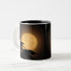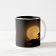 It's autumn, and a luminous golden yellow full moon has risen behind the black silhouettes of leaves blowing in the breeze on this dramatic fine art photography mug. The background is illuminated in tones of orange, gold and brown to create an abstract pattern in an Asian motif. The design is repeated on the right and left sides.