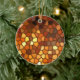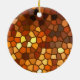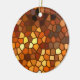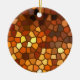 This decorative holiday ornament features a geometric abstract pattern of five sided pentagon shaped mosaic tiles in brilliant autumn colours of red, orange, brown, yellow, gold and white.