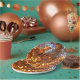 These decorative paper plates feature a geometric abstract pattern of five sided pentagon shaped mosaic tiles in brilliant autumn colours of red, orange, brown, yellow, gold, blue, purple, grey, black and white.