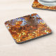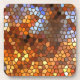 This set of decorative coasters features a geometric abstract pattern of pentagon shaped mosaic tiles in brilliant autumn colours of red, orange, brown, yellow, gold, blue, grey, black and white.