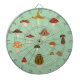 A collection of mushrooms in autumn browns, reds and oranges. The background is light green.