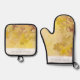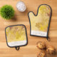 Oven Mitt & Pot Holder Set with Autumn nature oak leaves vintage landscape. Bright yellow and brown fall landscape with oak leaves. Silhouettes of leaves on spotted fall colours rustic background. Watercolor foliage painting background Wedding Oven Mitt & Pot Holder Set. Autumn Oak Leaves Collection.