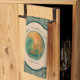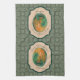 Pastel artwork portraying a ripening pumpkin with a single leaf, stem and tendril still attached to the vine in hues of orange and green decorates this kitchen towel that also features a fall chrysanthemum pattern in two shades of green and easy to customise text.