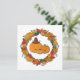 Whimsical autumn scene featuring smiling pumpkins within a vivid leaf wreath. Warm orange, yellow, and earthy greens evoke cozy fall vibes for kids, family apparel, and seasonal decor.