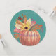 A dusky teal background embellished with a terracotta orange pumpkin and flowers in yellow, pink and plumb purple.